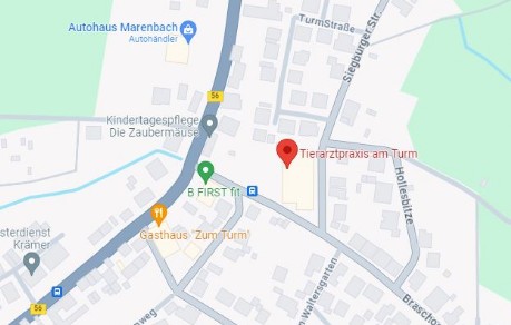 An der B56 von Siegburg nach Seelscheid liegt Siegburg Schreck. Kurz vor dem Fernsehturm geht nach rechts die Braschosser Straße ab. Hier liegt der Netto-Markt direkt auf der linken Seite. Unsere Praxis ist Teil des Netto-Marktes. Sie können die Parkplätze vor der Türe nutzen.