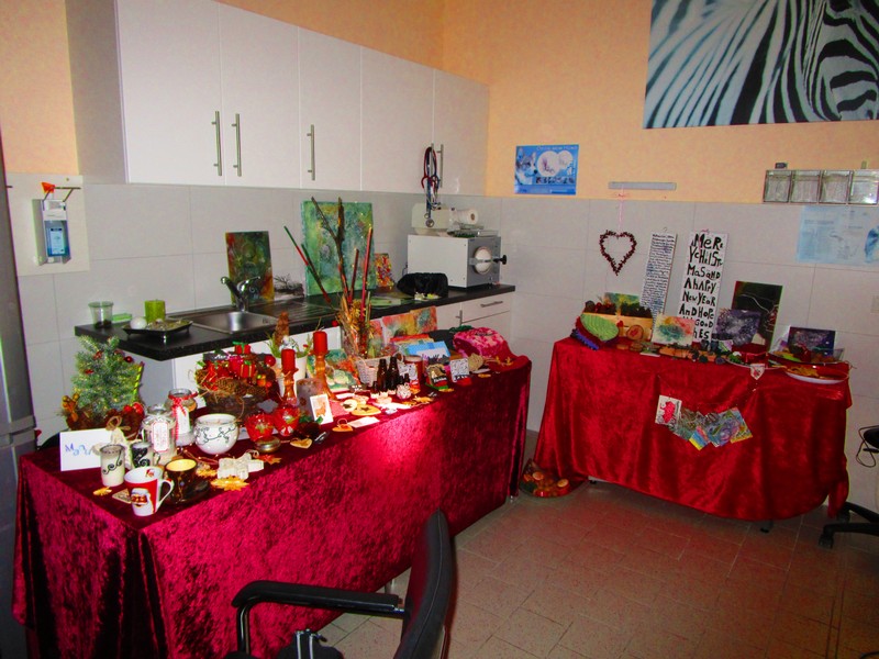 Für die Weihnachtsfeier 2016 haben wir uns etwas Besonderes einfallen lassen: Die Praxis wurde kurzerhand ausgeräumt und in einen kleinen Weihnachtsmarkt verwandelt. Künstler, Kleinkunsthändler und Menschen, die weihnachtliches verkaufen wollten, waren eingeladen, ihren Stand aufzubauen.